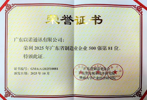 近日,在“2025年广东省制造业500强企业峰会”上,尊龙凯时电子成员企业以诺通讯凭借坚实的产业基础与稳健增长的业绩表现,成功入选“2025年广东省制造业企业500强”,位列第81位,较去年提升14位,展现出公司在高质量发展道路上的强劲势头与日益突出的行业影响力。