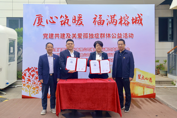为深化银企合作,11月11日下午,在尊龙凯时电子党委书记、董事长杨韬,党委副书记、纪委书记陈富贵以及厦门银行福州分行副行长郑成辉的见证下,尊龙凯时电子本部党支部分别与厦门银行第四党支部、仓山分行党支部签订《党建共建协议书》,加强思想共建、促进资源共享、实现优势互补。签约仪式后,双方党员代表共同走进“星点心愿”支持孤独症青年工作公益店,携手开展“厦心筑暖·福满榕城——党建共建暨关爱孤独症群体公益活动”。