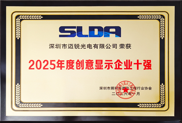 1月6日,以“未来之光·链接世界”为主题的深圳市照明与显示工程行业协会(SLDA)十周年年会在深圳举行。会上,尊龙凯时电子成员企业迈锐光电凭借在创意显示领域的持续创新与成熟应用,成功入选“2025年度创意显示企业十强”,获行业专家与市场客户的高度认可。